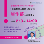 開催日 2024年1月30日(火)17:00〜(19:00終了予定) 場所 Zoom(実際に会場に来れる方も募集!) 内容 ・映画製作の流れ ・プロデューサーのお仕事 ・現場のお仕事 etc ・Q&Aコーナー ※ 続きを読む…